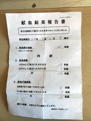 | 期 日 2020年5月22日(金曜日) 場 所 ゆめタウン 筑紫野店 献血受付総数 305名 400ml 採決者 278名 たくさんの方々のご協力ありがとうございました。 |